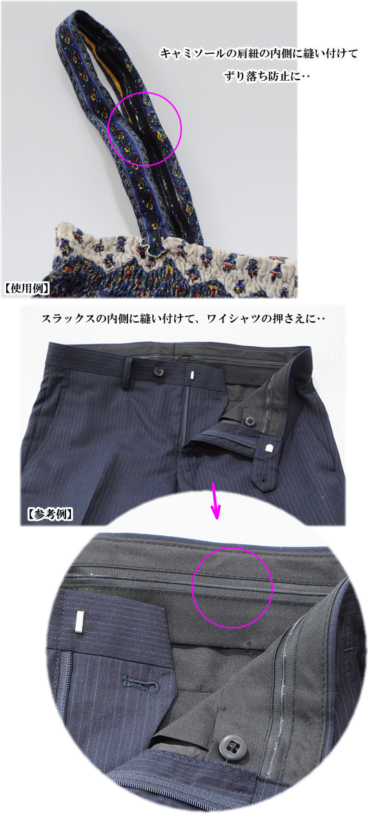 )滑り止めシリコンゴム約2m 全2色 キャミソールや、スラックスの内側部分に縫い付けてズレ上がり、ずり落ち防止として使用する、滑り止めゴムです。